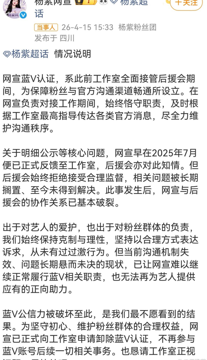 4月15日,杨紫网宣组宣布申请卸除官方蓝V认证,正式退出与后援会的协作体系,这一决定源于长期财务不透明、沟通机制失效等核心矛盾,而「后援会关注迪丽热巴超话」事件成为引爆信任危机的导火索。